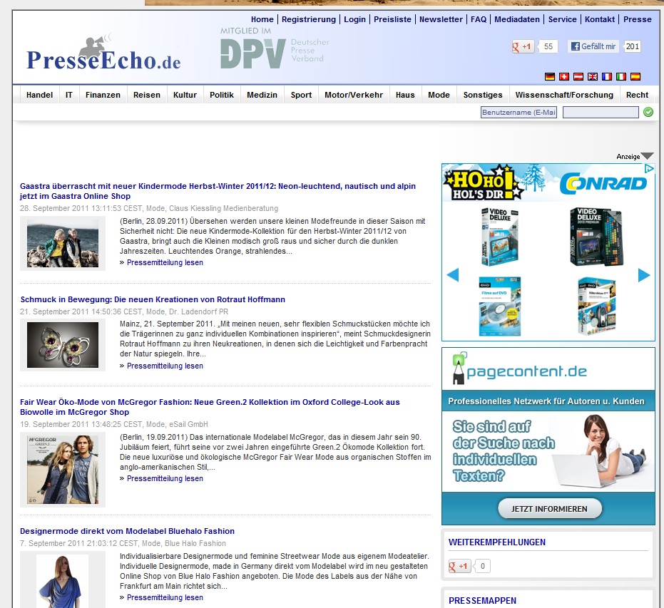 Unternehmen und Journalisten können auf Presseecho kostenlos Pressemitteilungen veröffentlichen. Das Portal des Unternehmens Stern Consulting aus Berlin bietet Firmen, Vereinen, aber auch freien Journalisten, interessante Artikel kostenlos zu verbreiten. Folgende Rubriken umfasst das Nachrichtenportal: IT, News, Politik, Handel, Damenmode, Sport, Reisen, Kultur u.v.m Es kann sogar noch kostenlos ein Bild hochgeladen werden. Presseecho ist Mitglied im Deutscher Presse Verband DPV.